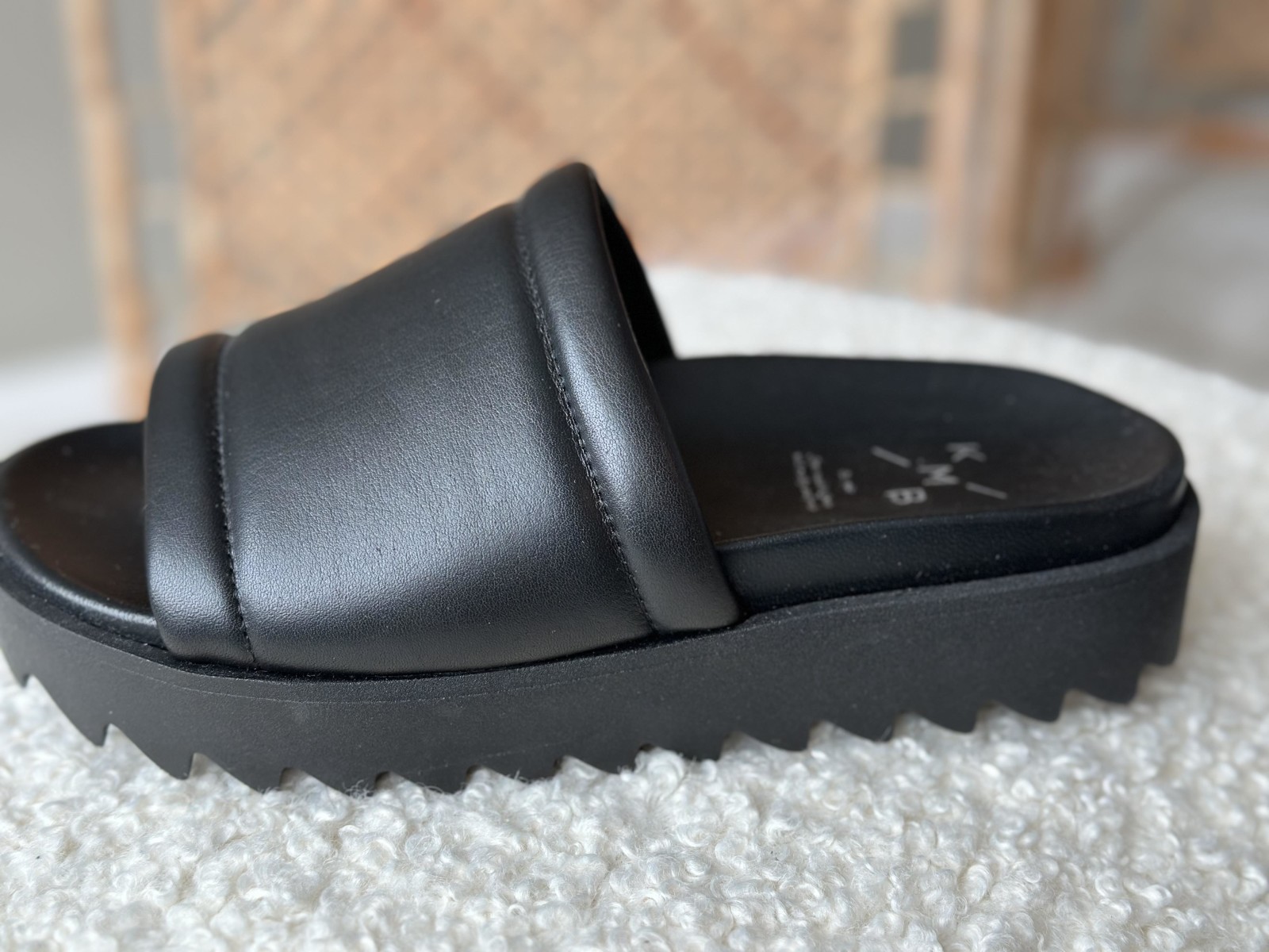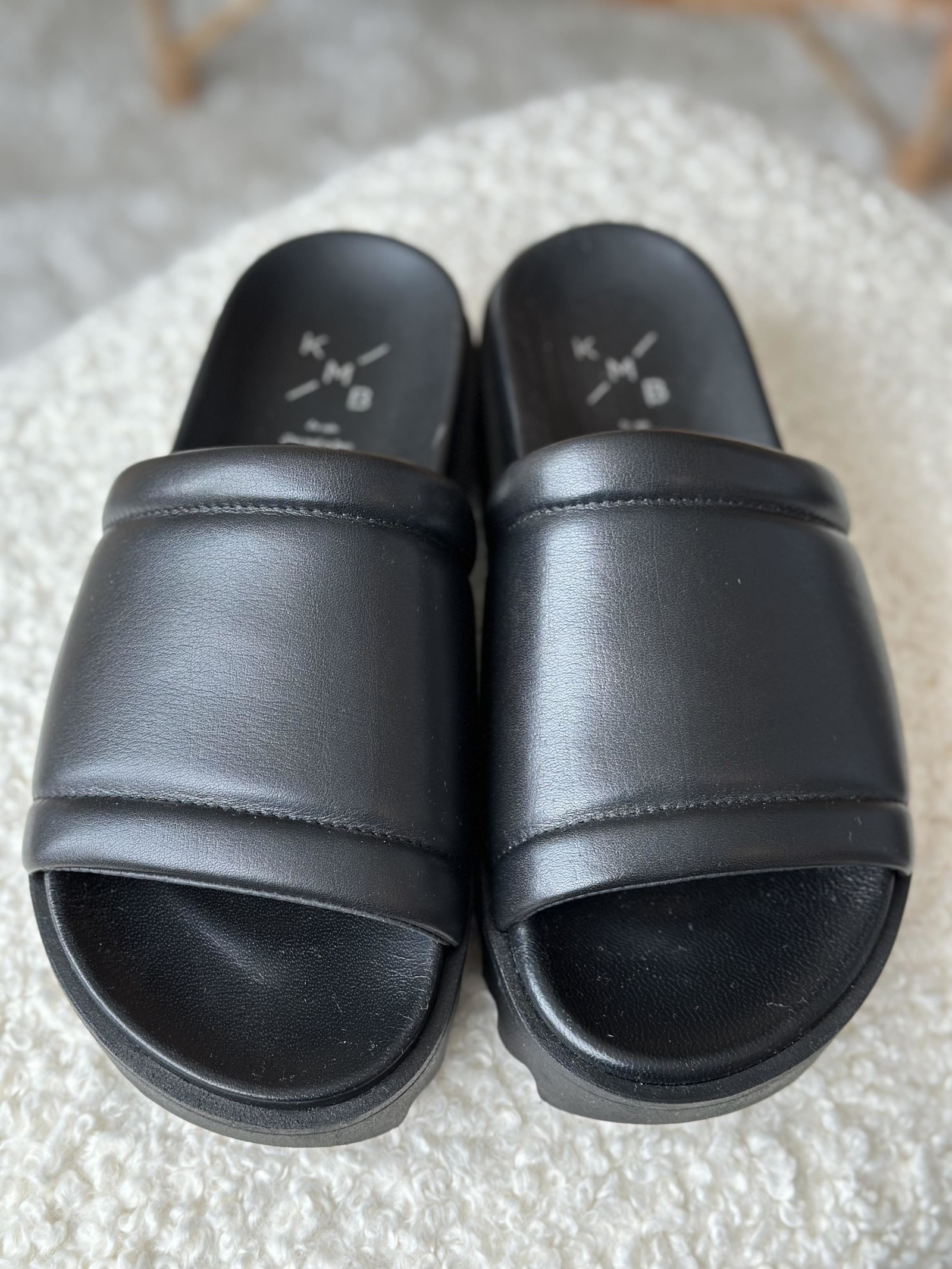 Plattform sandal med bred reim over rista. God og stødig på foten. Laget i deilig mykt skinn.