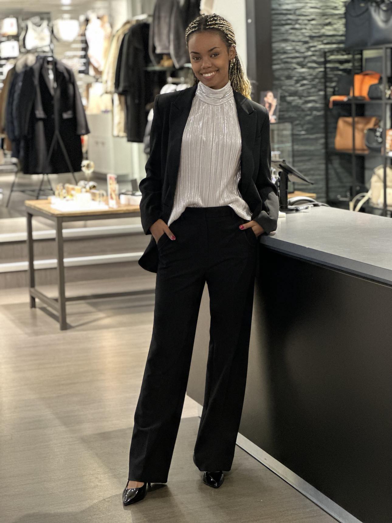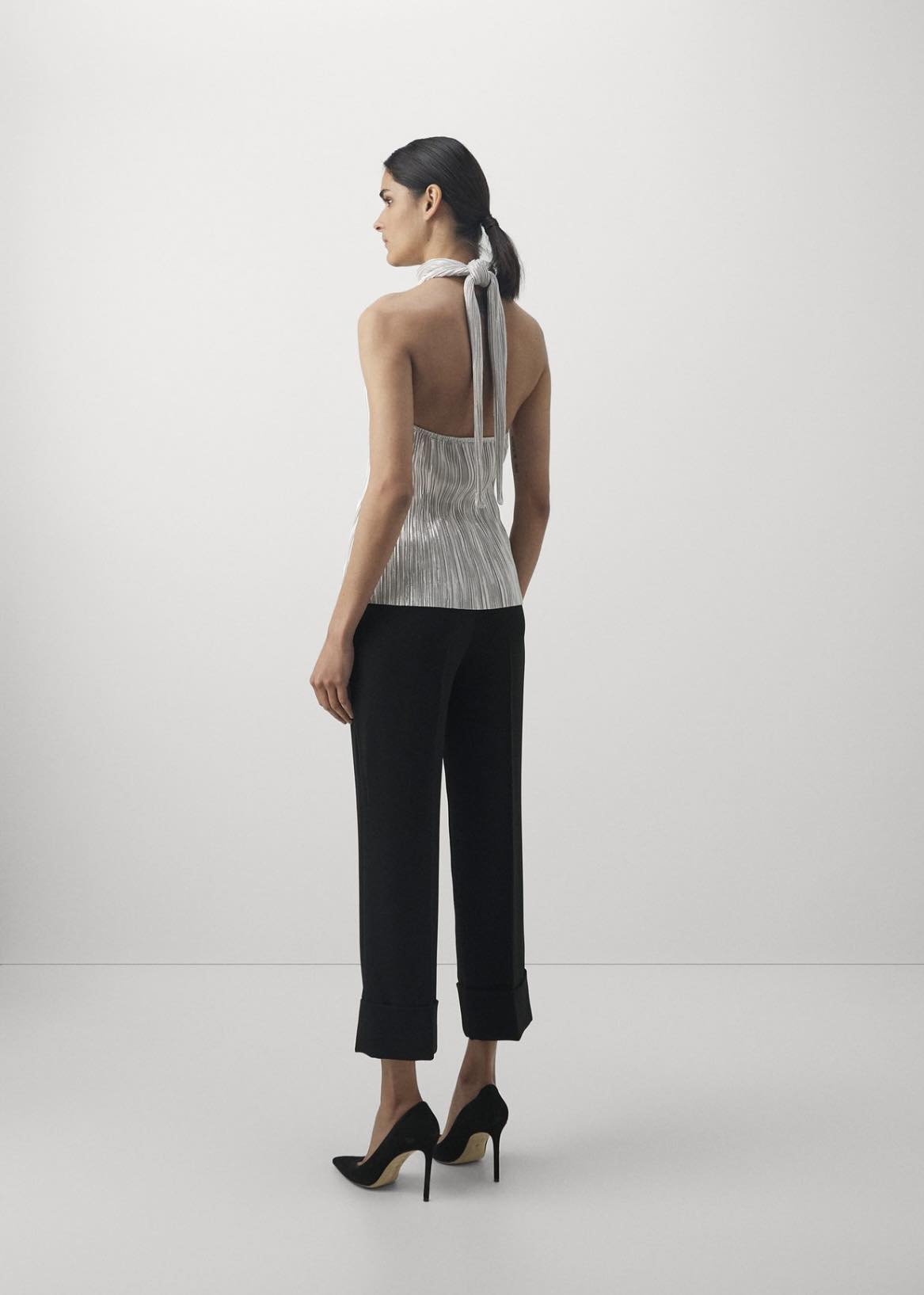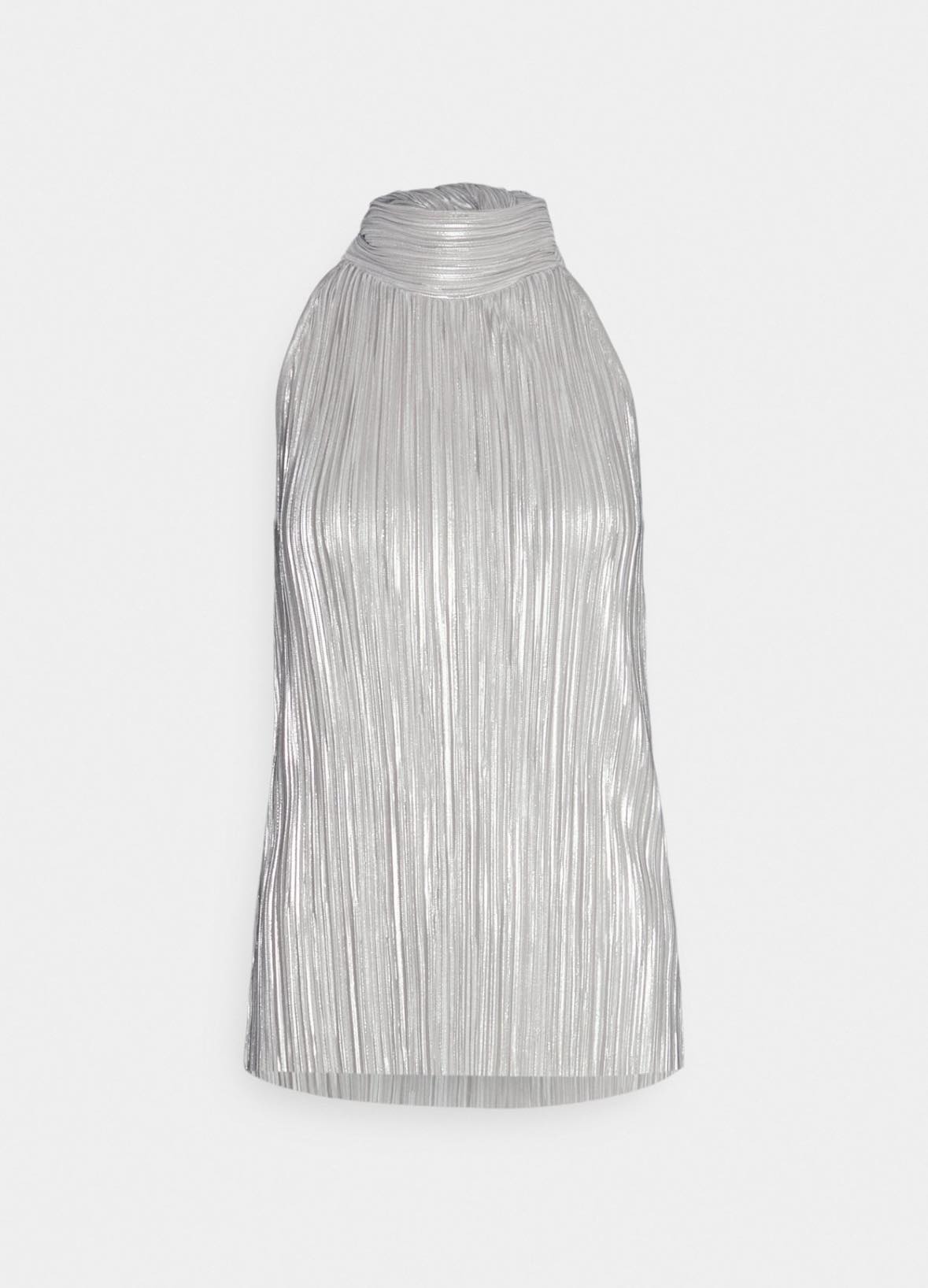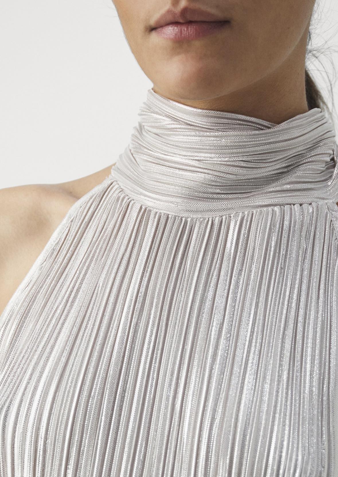 Metallisk, ermeløs halterneck top med høy hals. Lav rygg og god vidde.