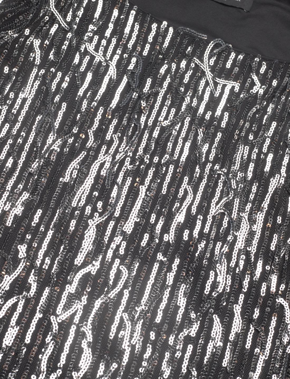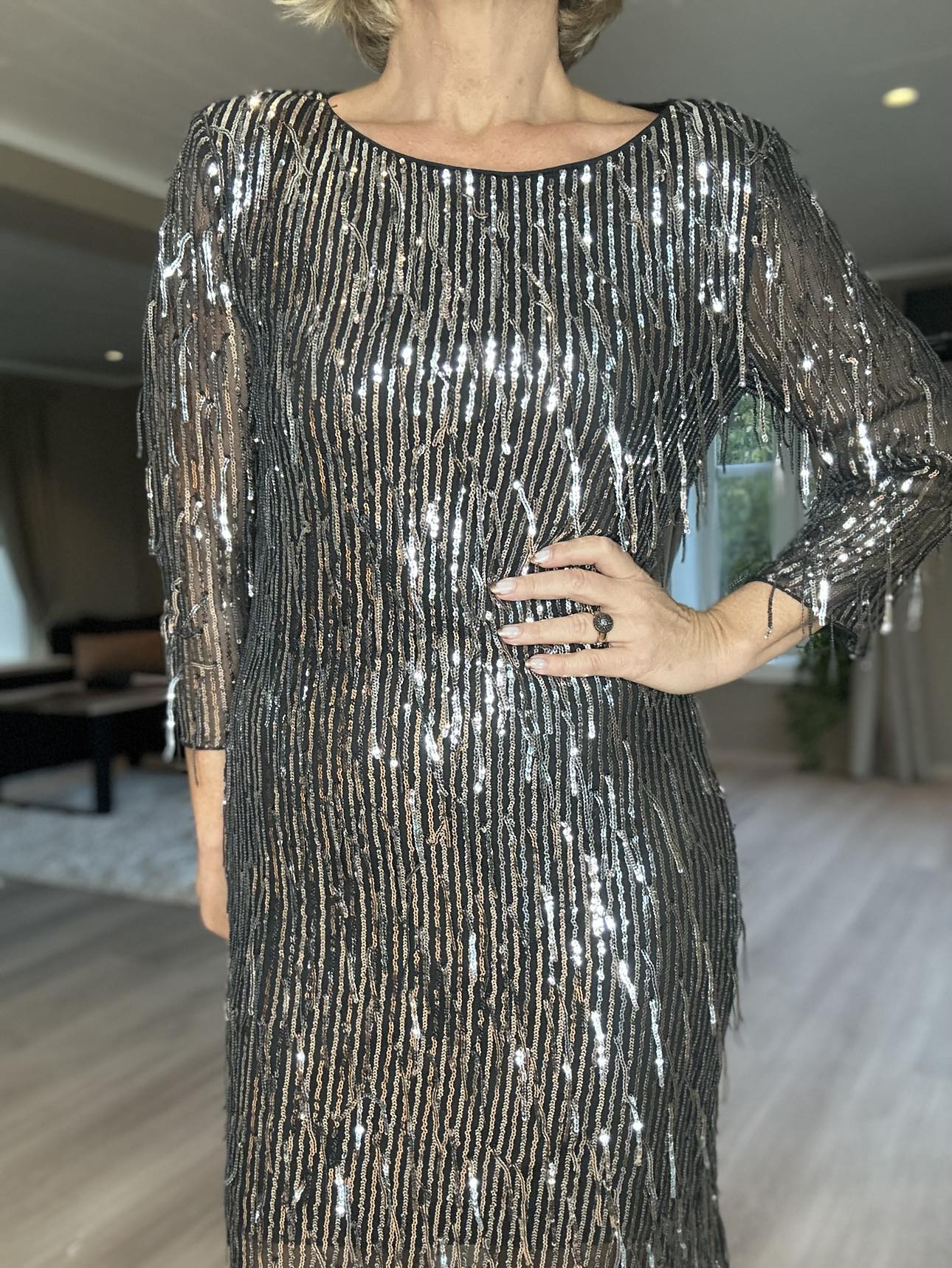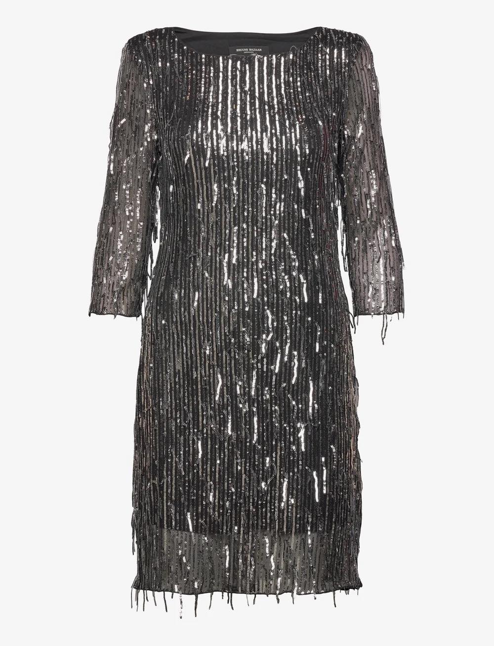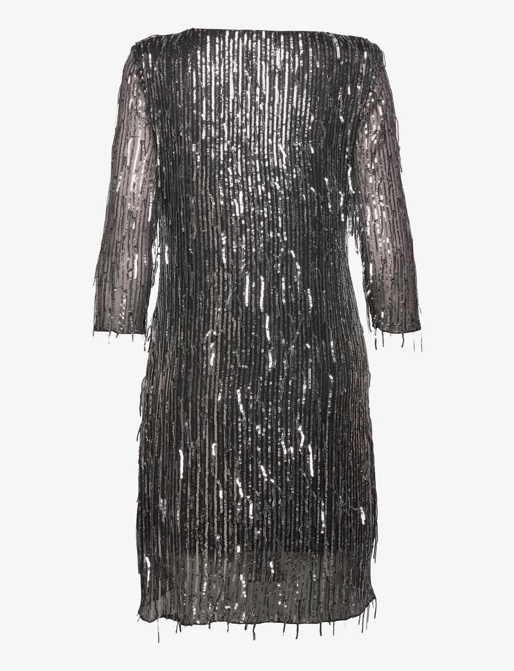 Glitrende kjole med paljett detaljer. Laget i mesh stoff med rund hals og kropsnær fasong. 3/4 arm og knelengde.