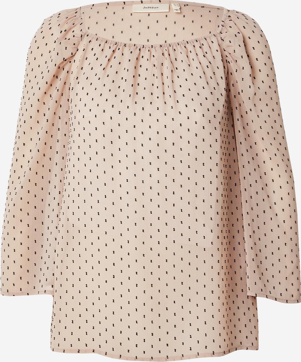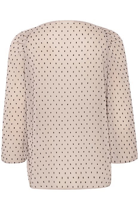 Tynn chiffon bluse i beige med sorte prikker. 3/4 løse armer med liten puff og rund hals med litt vidde og strikk øverst.