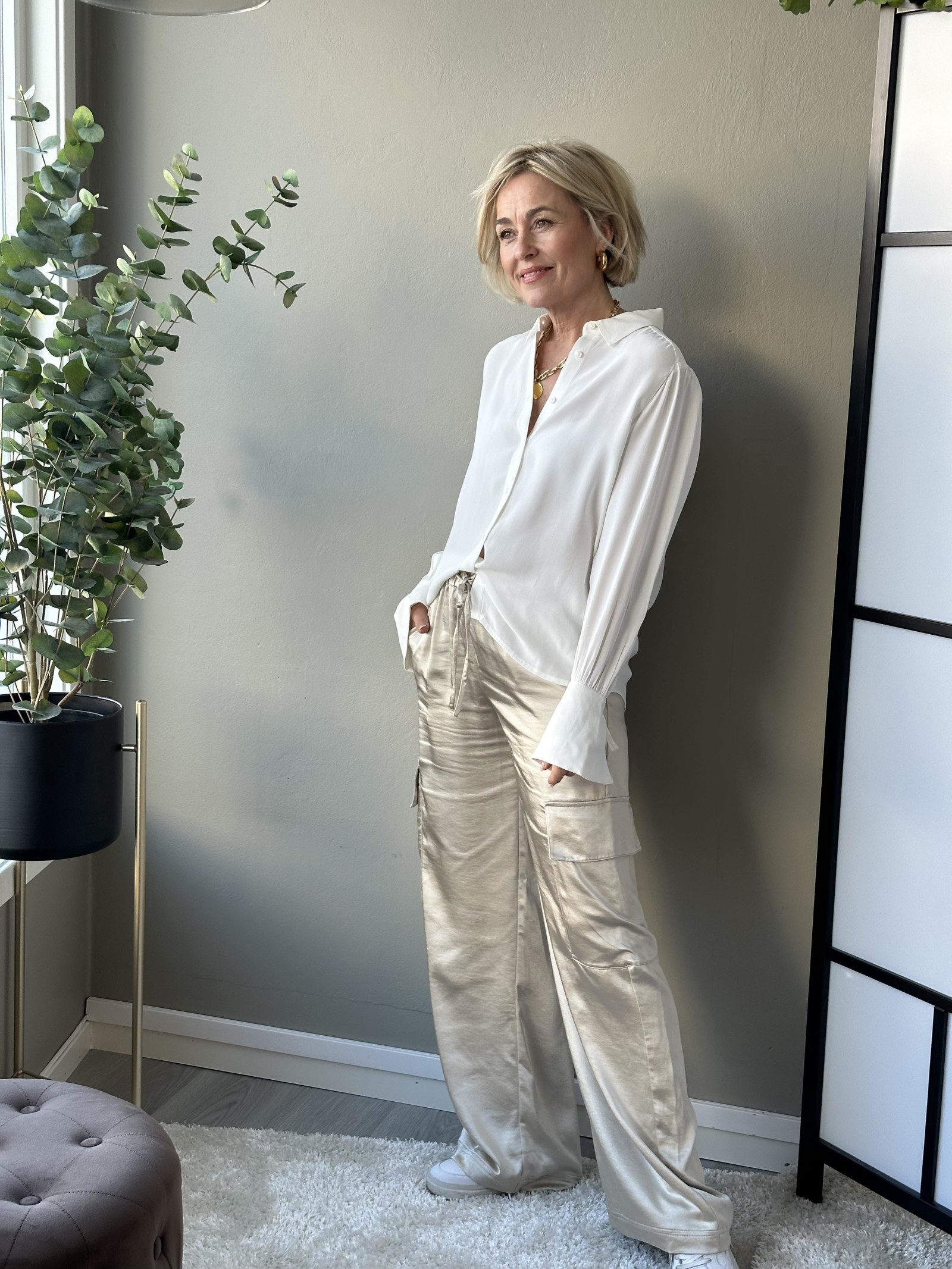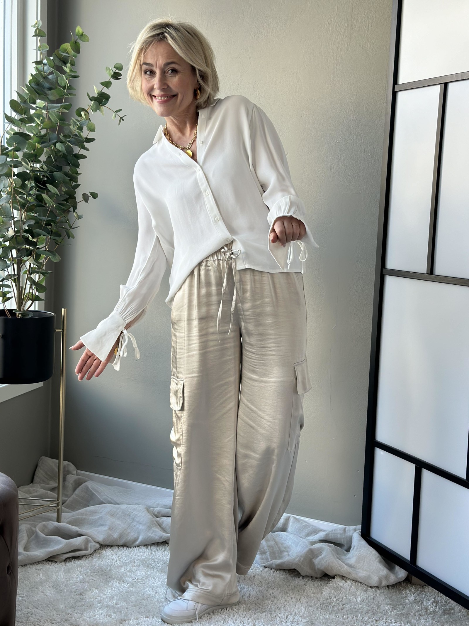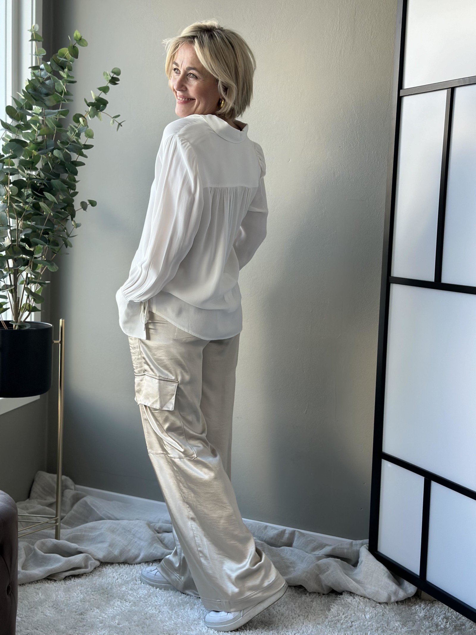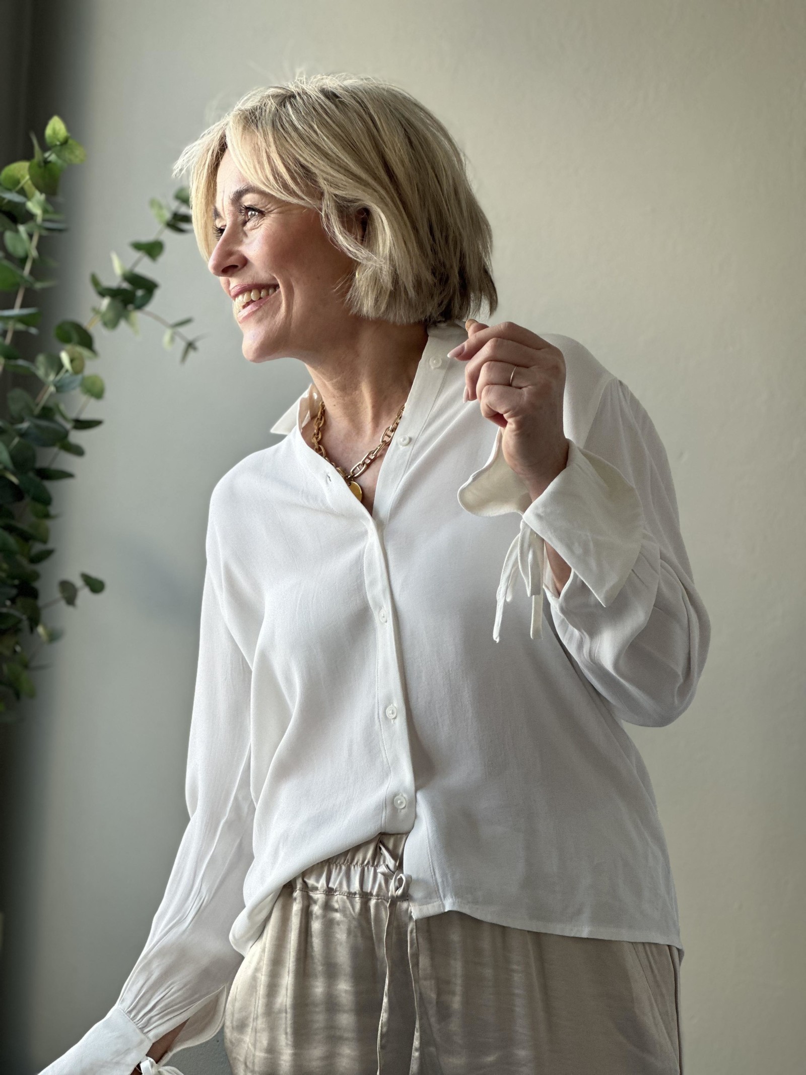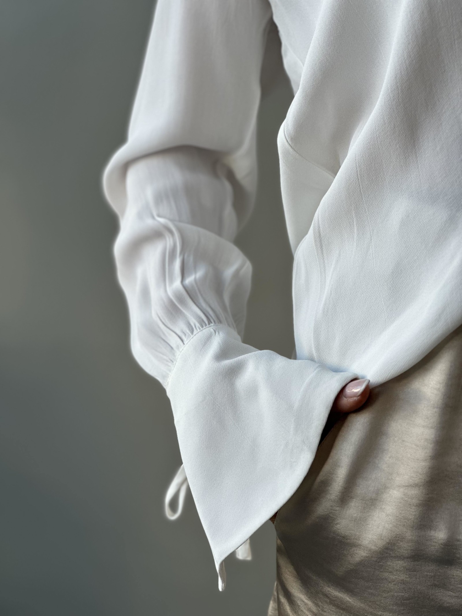 Klassisk bluse med den lille ekstra detaljen på ermene. Knappelukking hele veien i front med krage. Brede trompet mansjetter på ermene med knyting. Liten puff på skuldrene.