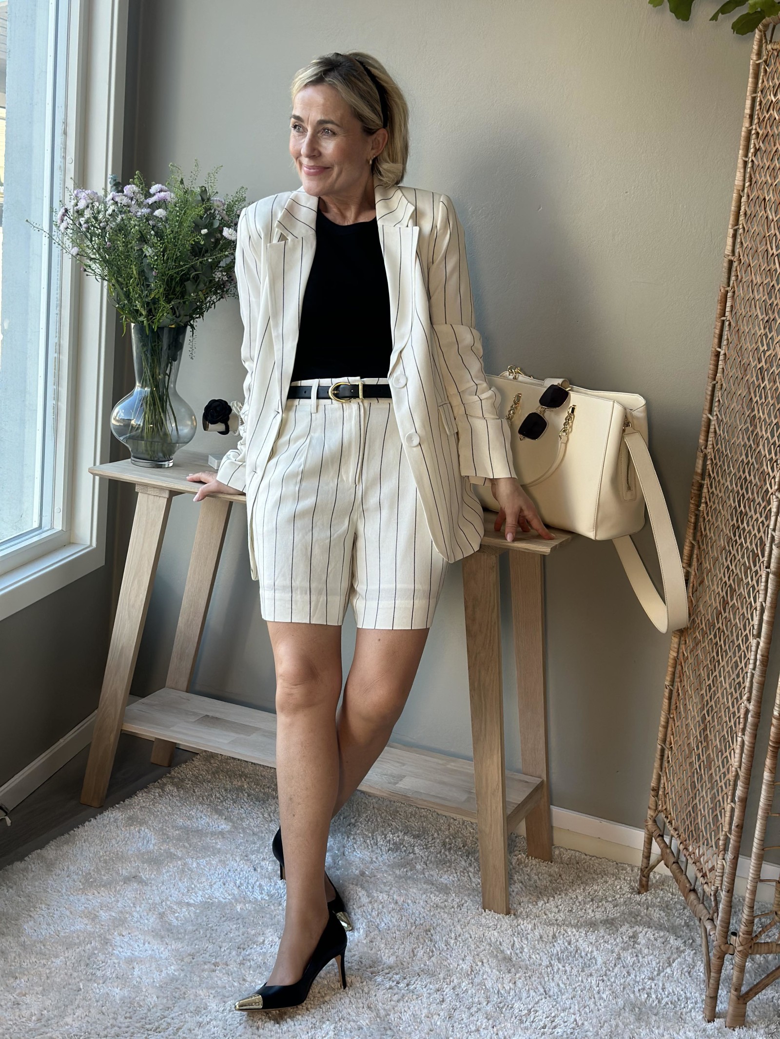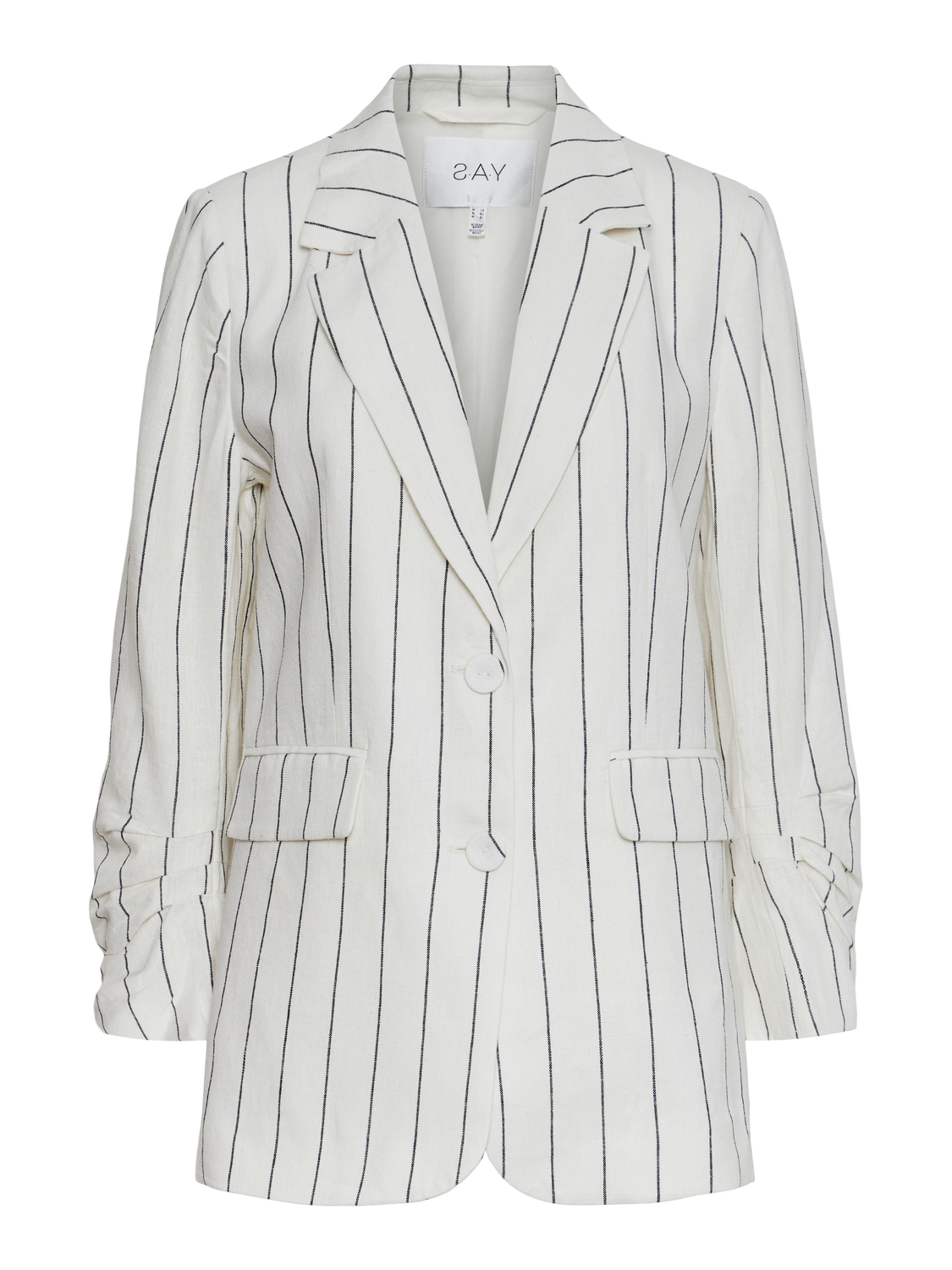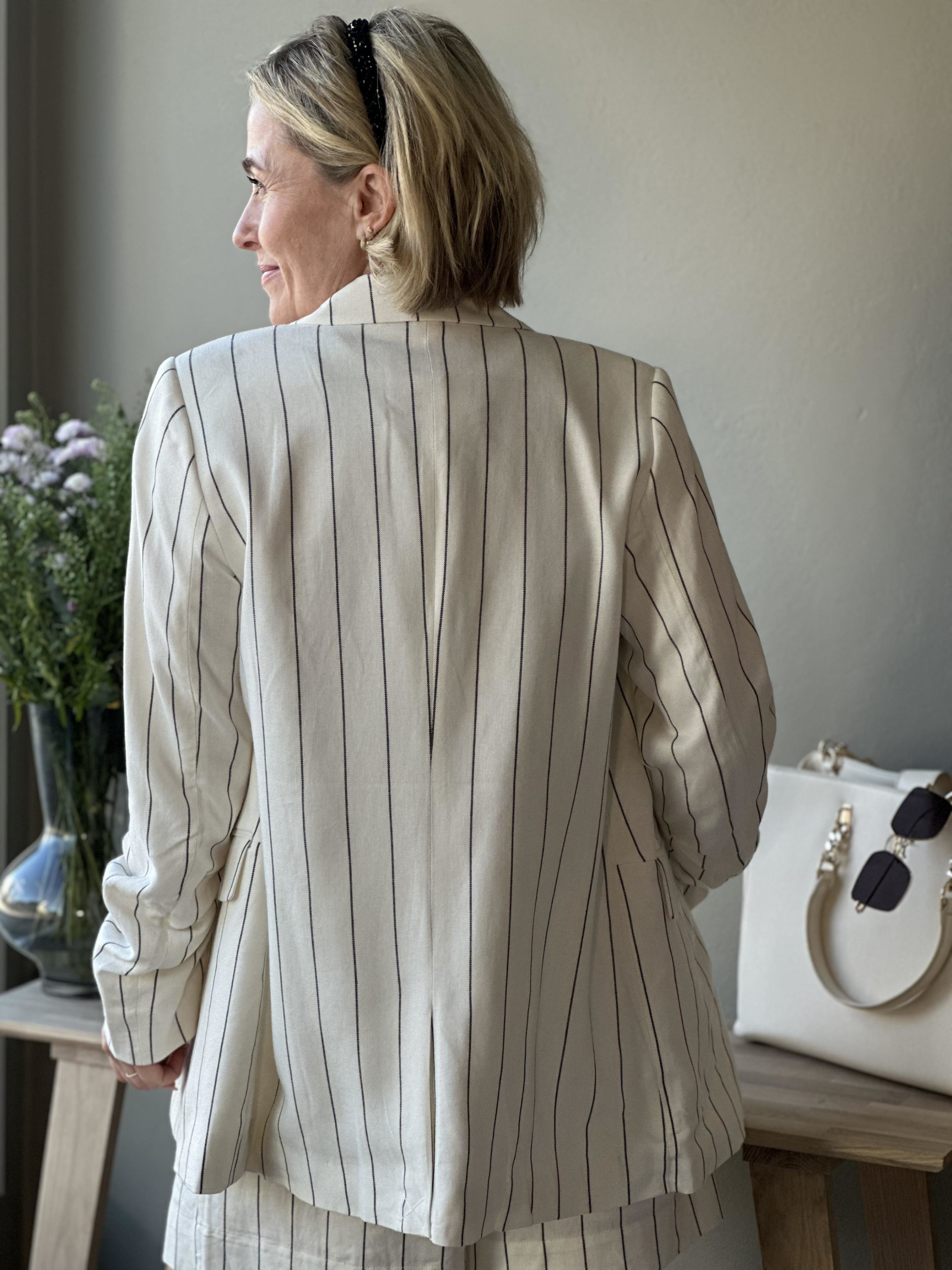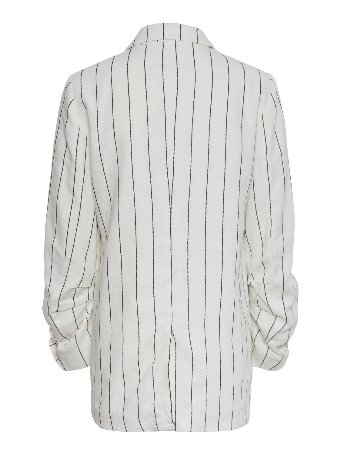 Enkeltspent, stripete blazer i linblanding med tekstiltrukne knapper og innskårede jakkeslag. Lange ermer med rynkeeffekt og plisserte detaljer bak. Innfelte forlommer med klaff. Normal passform. Bruk den gjerne sammen med den matchende shortsen for en hel dress.