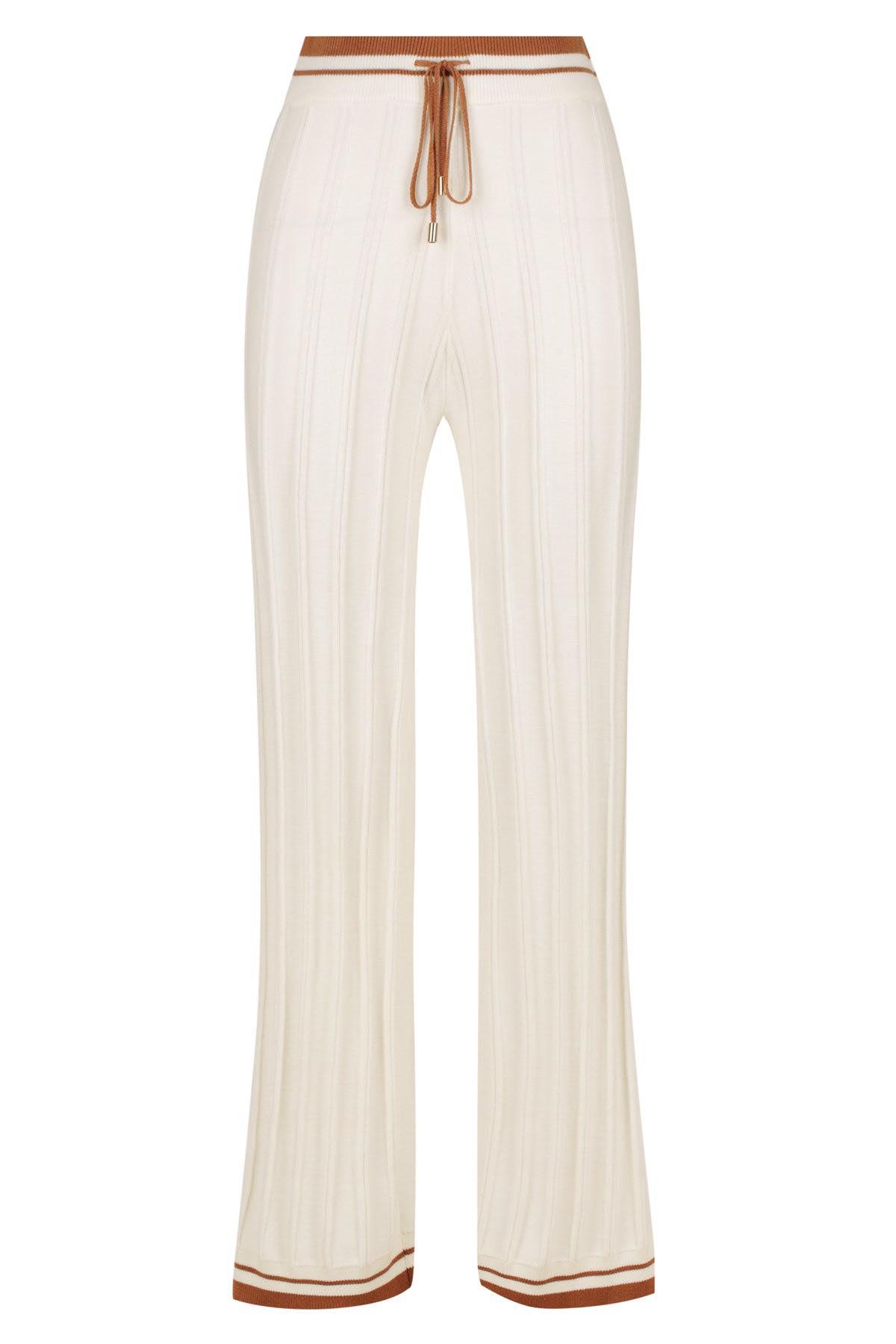 Strikkebukser med tynn rib i deilig bomullsblanding med høyt liv og full lengde. Avslappet fasong med kontrastfarge på kantene. Bruk den gjerne sammen med den matchende toppen som en hel dress.