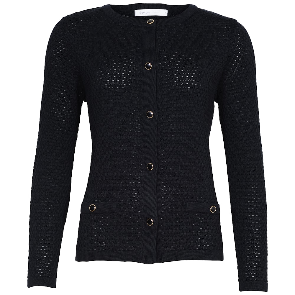 Skovhuus cardigan i sjømannsbobler med øye for detaljen. Den flotte strukturen med «sjømannsbobler» gir et tidløst preg som kan styles til både hverdag og fest. Kantene ved halsen og åpningen er ketlet, slik at den rundes av på en fin måte som understreker vår høye kvalitet. Knappene er enkle med en liten gullkant som gir et vintage-look. Lommeeffekten gir denne cardiganen et utseende som en jakke, slik at du uten problemer kan bruke den som en fin jakke om sommeren og til innendørsarrangementer.