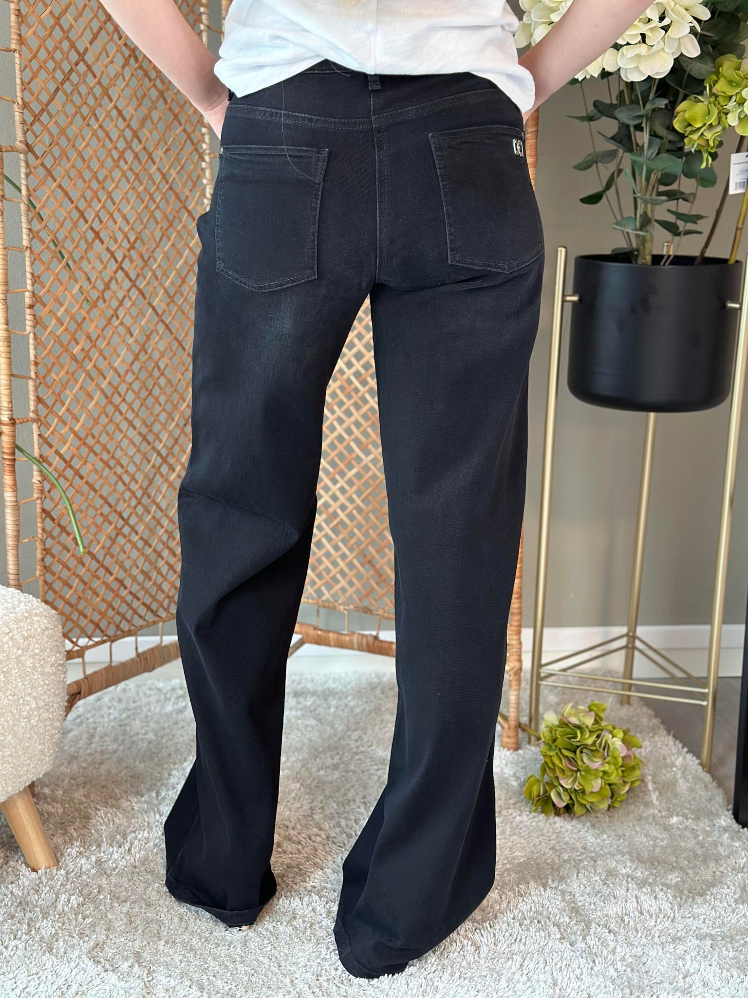 Super kul wide leg jeans i myk bomull med god stretch. Medium høyde på livet. Sitter godt rundt hoftene. Klassisk 5 lommers modell. Malin er 1,62 og har på str.34. Lengde på denne buksa er 34''. Så litt lang for Malin ;)
