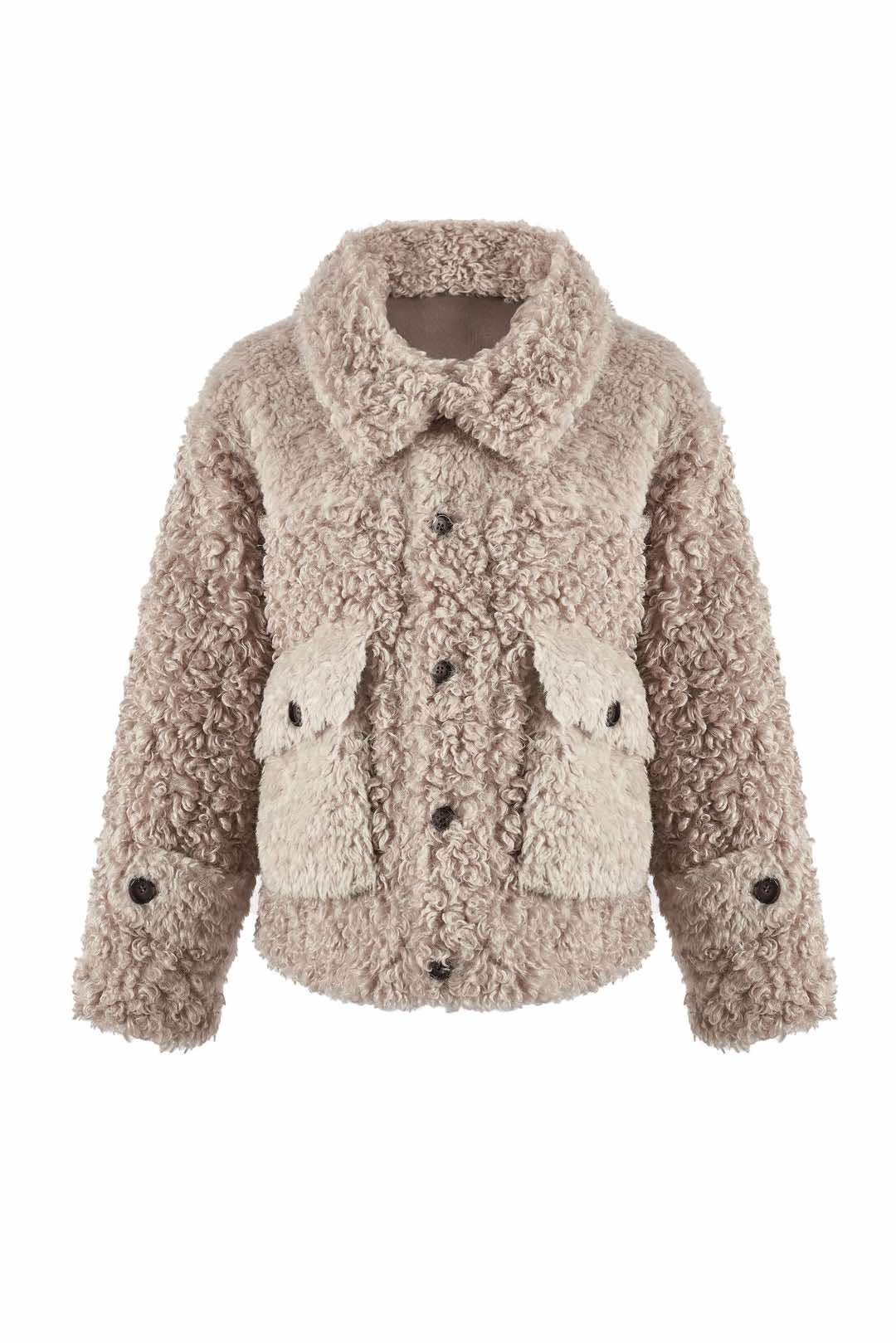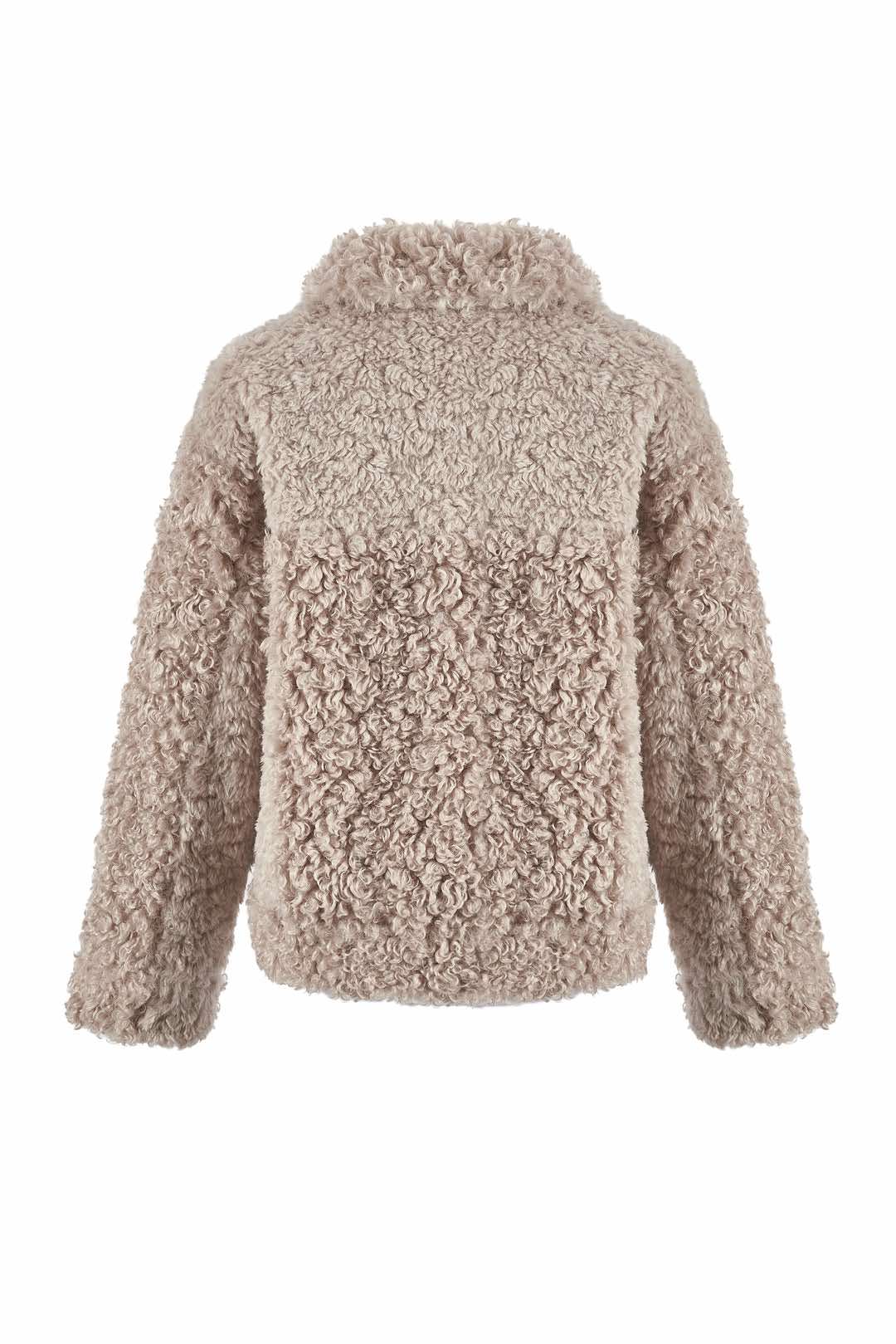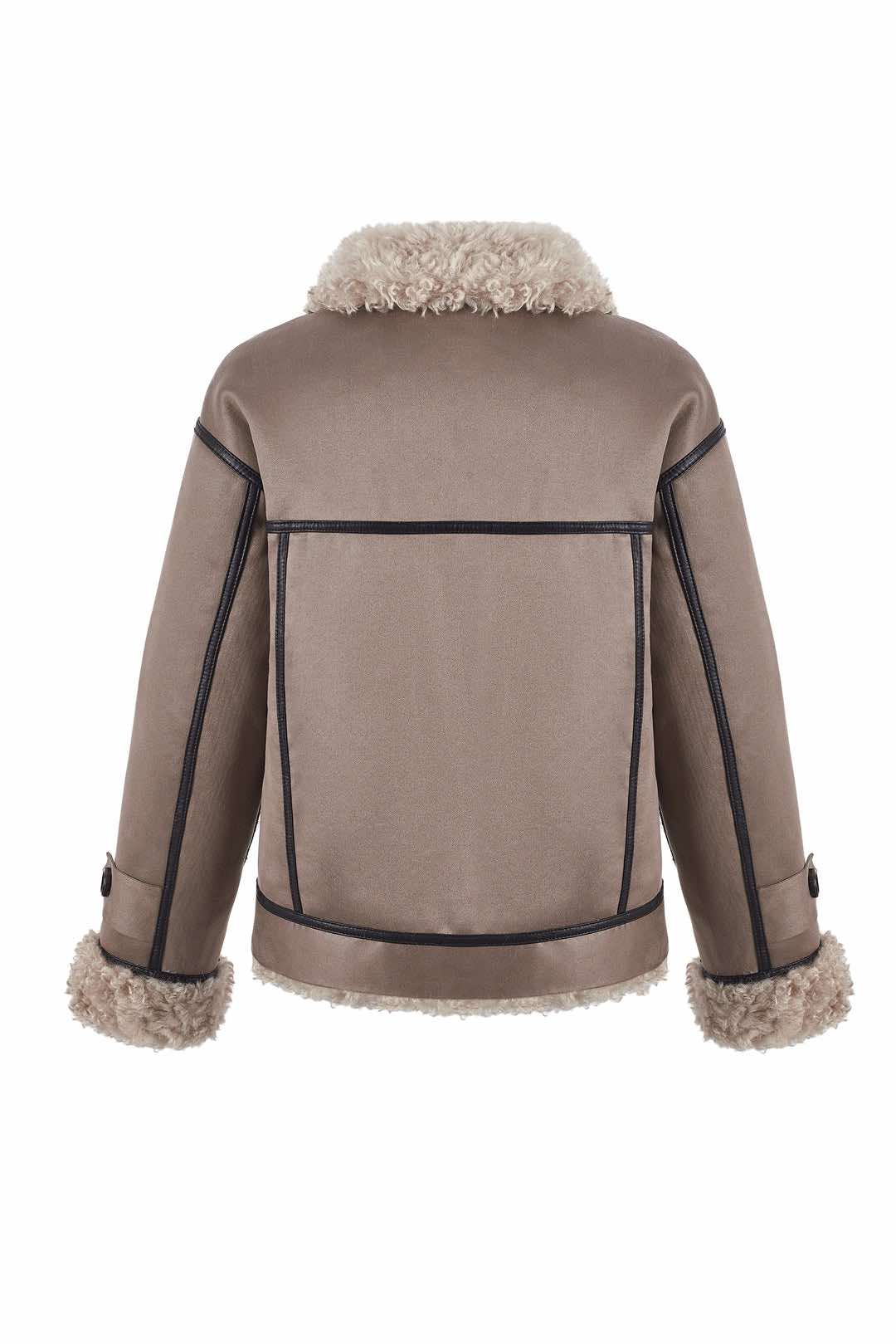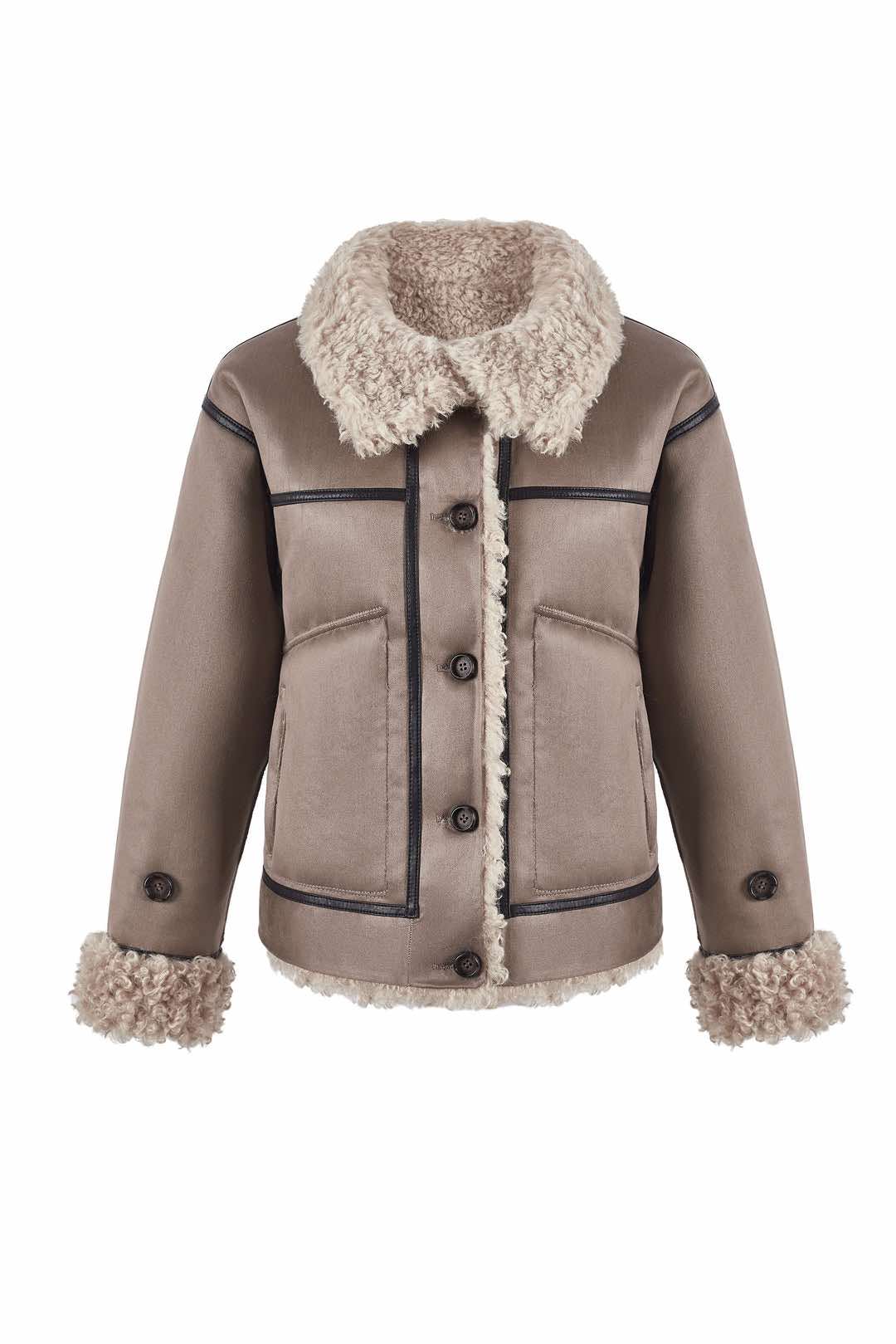 Tøff jakke du kan bruke på begge sider. Krøllete ''goat look'' på den ene siden og semsket look på andre siden med kontrastsømmer og pels detaljer. Knappelukking og store påsydde lommer. Krage.