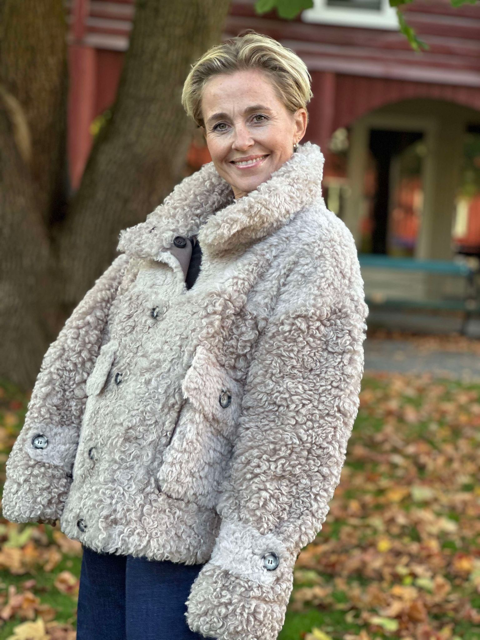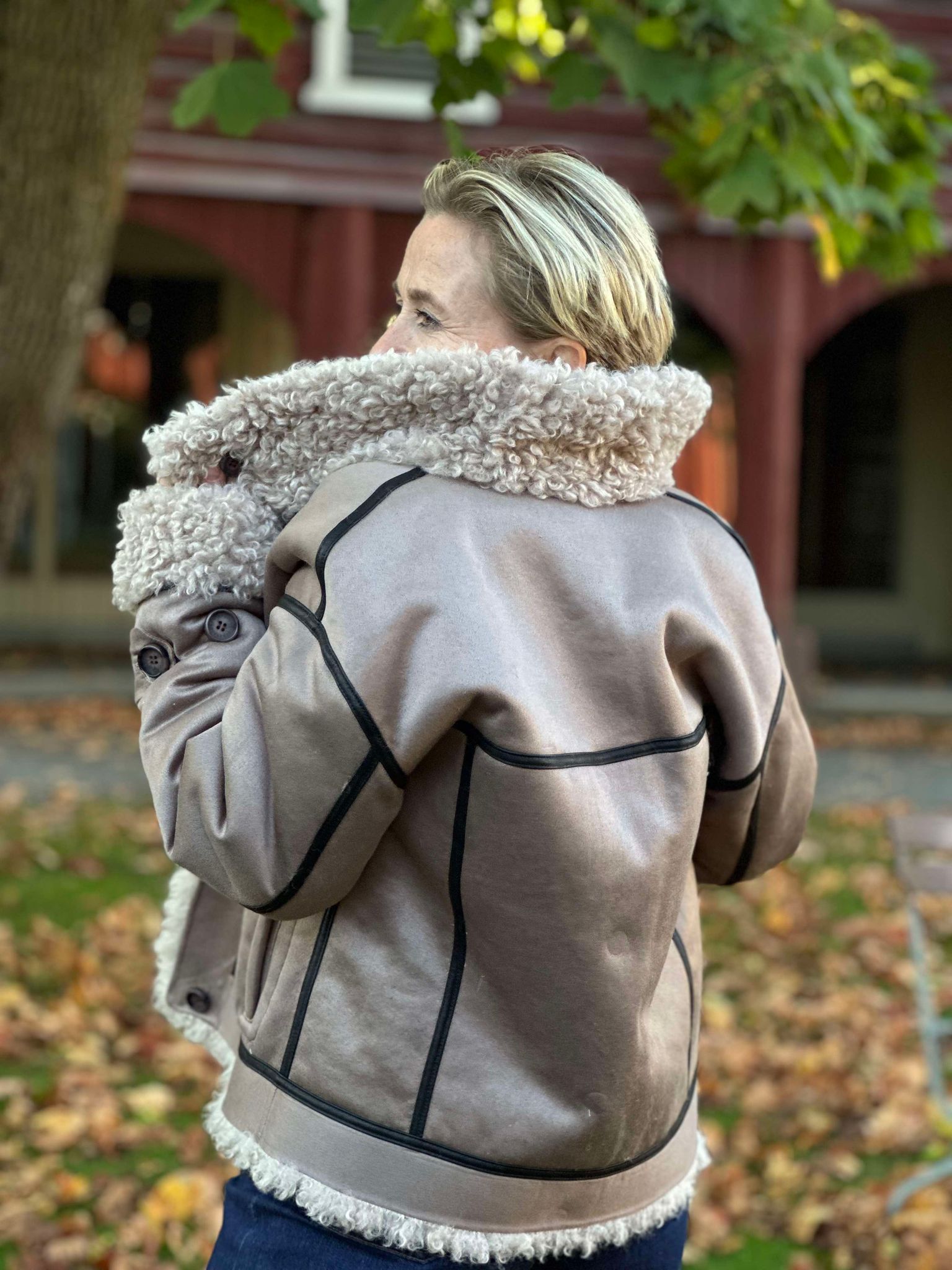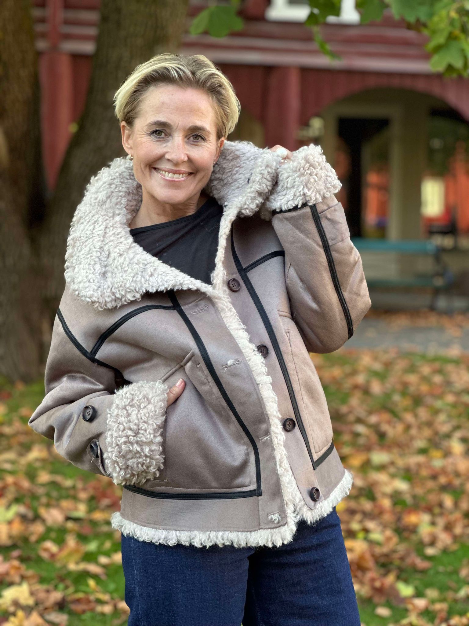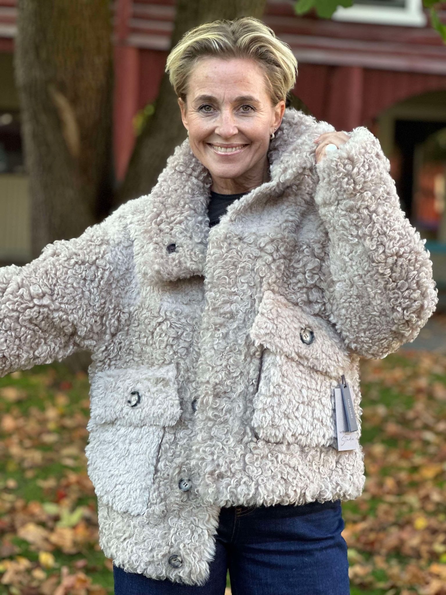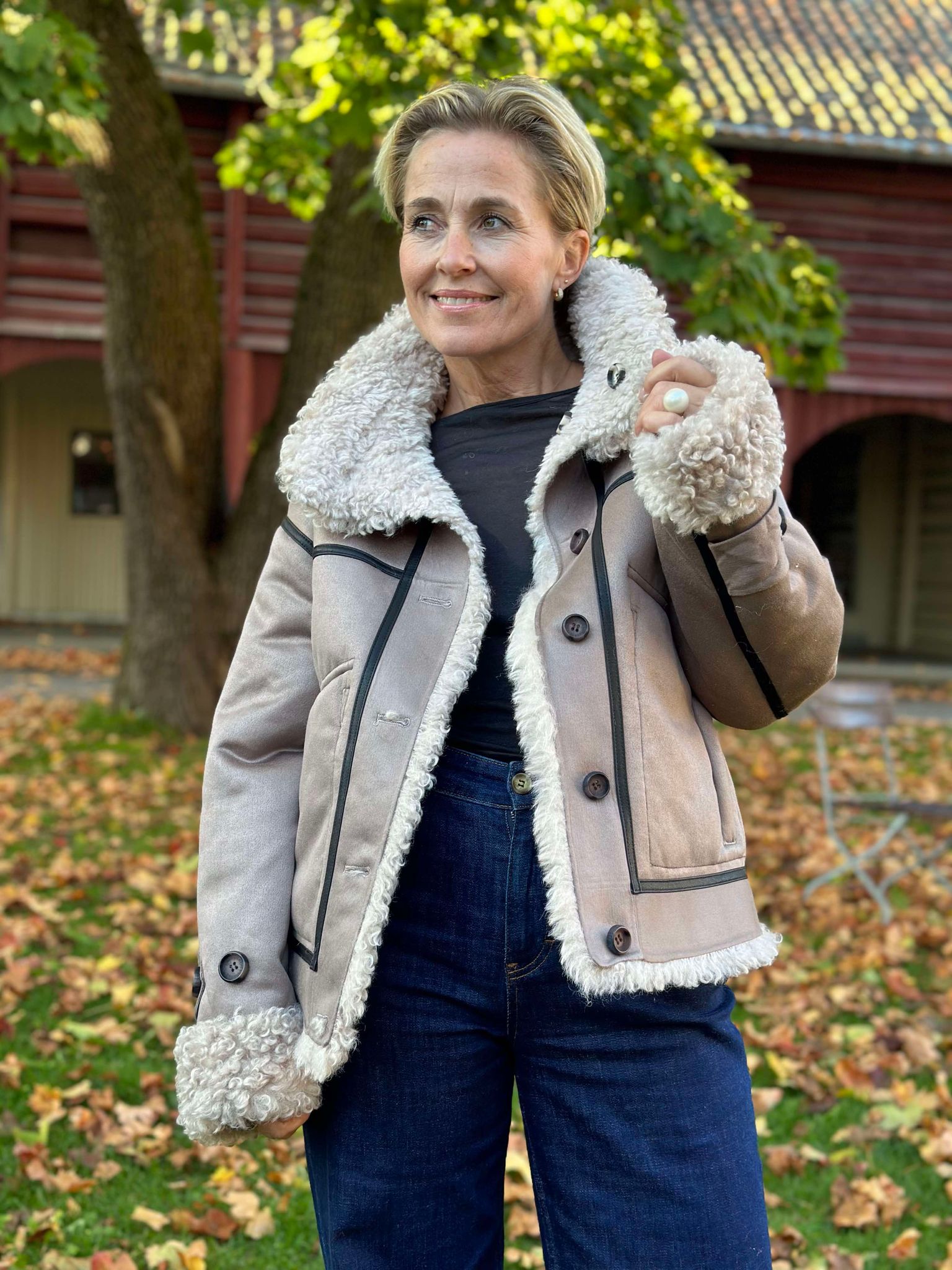 Tøff jakke du kan bruke på begge sider. Krøllete ''goat look'' på den ene siden og semsket look på andre siden med kontrastsømmer og pels detaljer. Knappelukking og store påsydde lommer. Krage.
