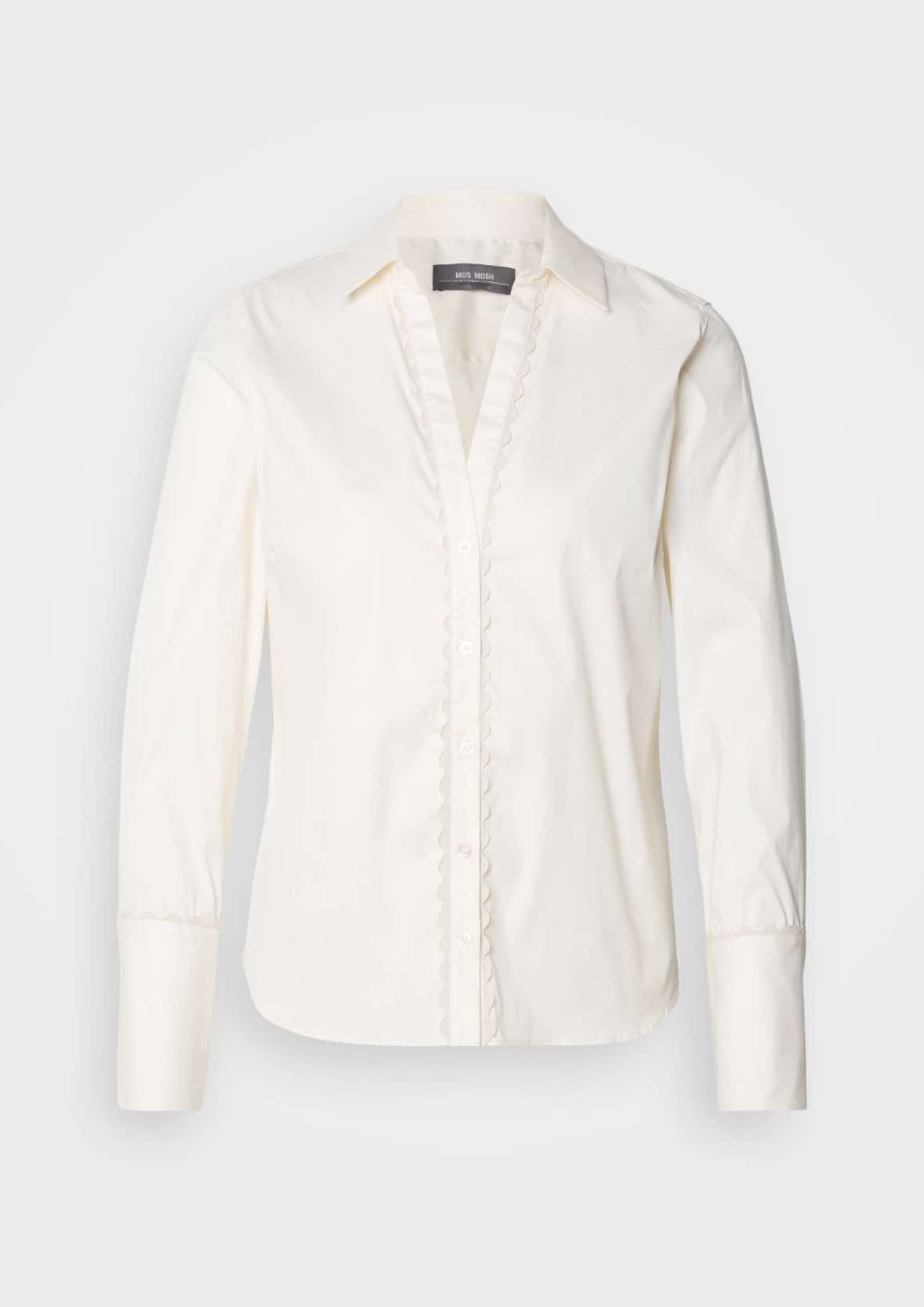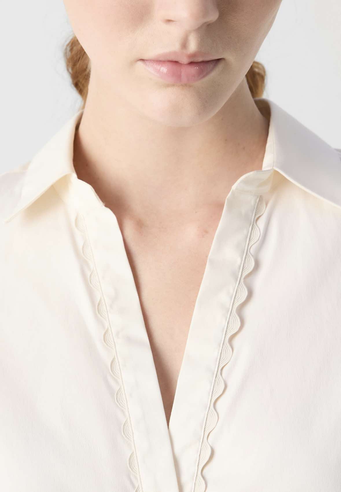 Myk skjorte med god stretch, v utringing og krage. Knappelukking hele veien- som starter litt nedpå brystet. Bølgebord langs knappestolpen som en ekstra detalj. Brede mansjetter med knappelukking.
