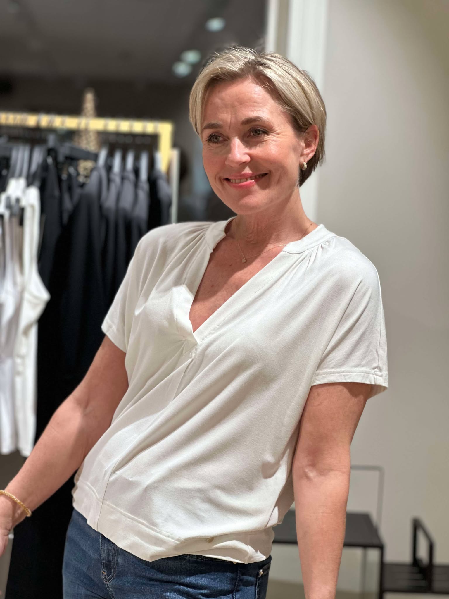 Tidløs t-skjorte laget av viskose som føles svært behagelig mot huden. Et elegant utsende med v-hals, samtidg som foldene på t-skjorten gir de det lille ekstra.