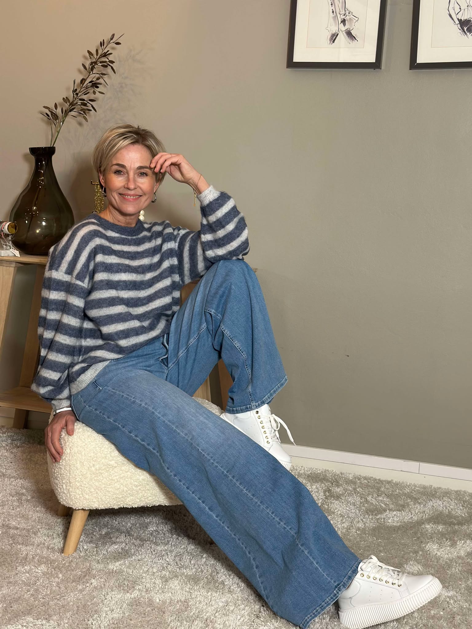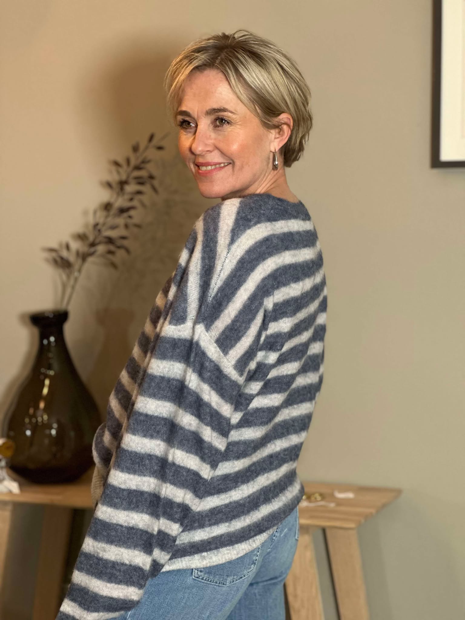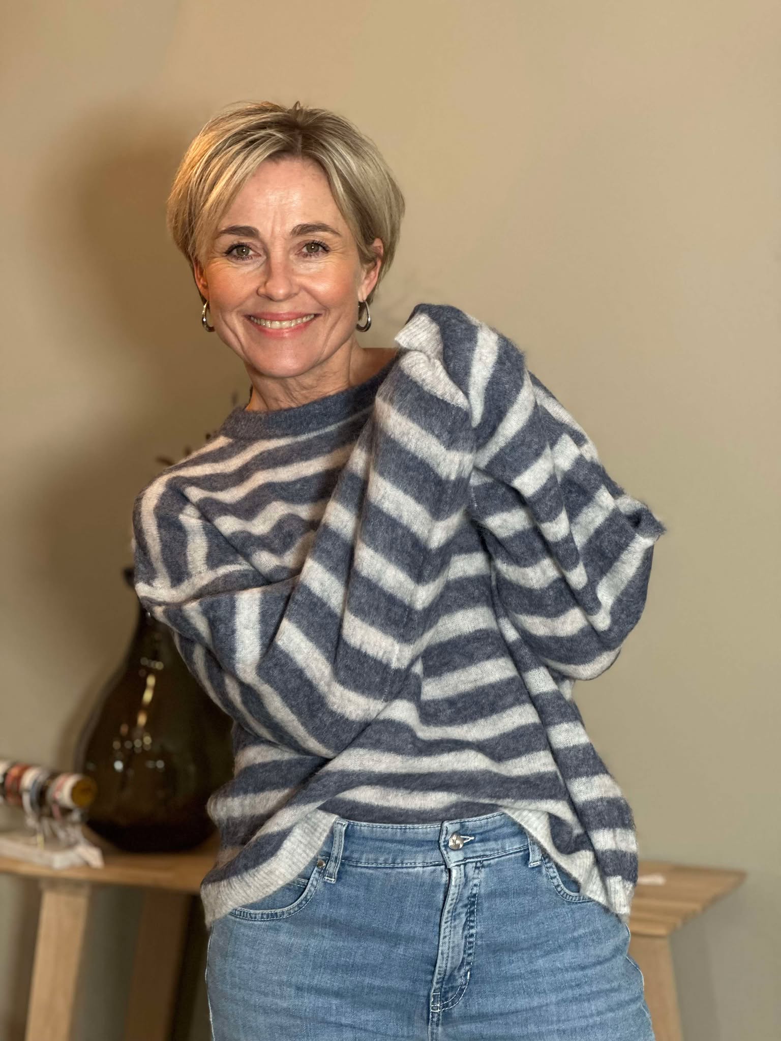 Super fin genser med deilig stoff. Fint mønster i grå å blå.Genseren har en vid passform.Det er strikk nederst på armen og nederst på genseren.