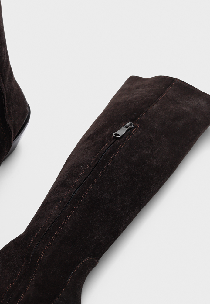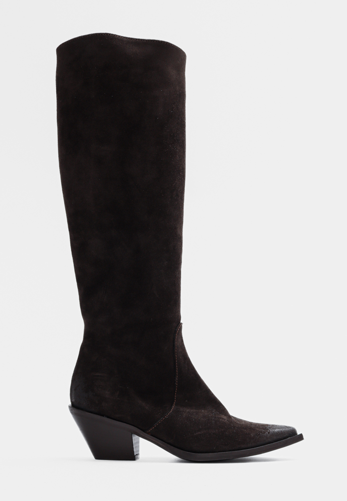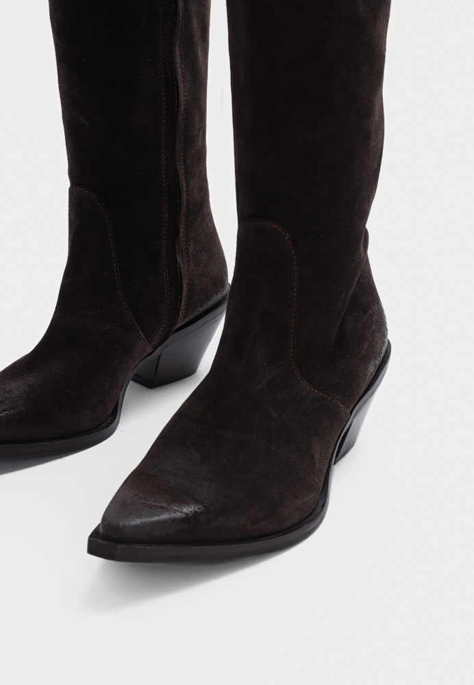 Feminin og tøff semsket cowboy støvlett med spiss tå. Slitte detaljer foran og på hælen. God passform. Like fin til favoritt jeansen som til et tøft skjørt. Glidelåslukking på innsiden.