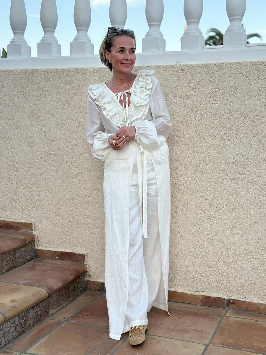 Romantisk bluse med rysjer og knyting i halsen.