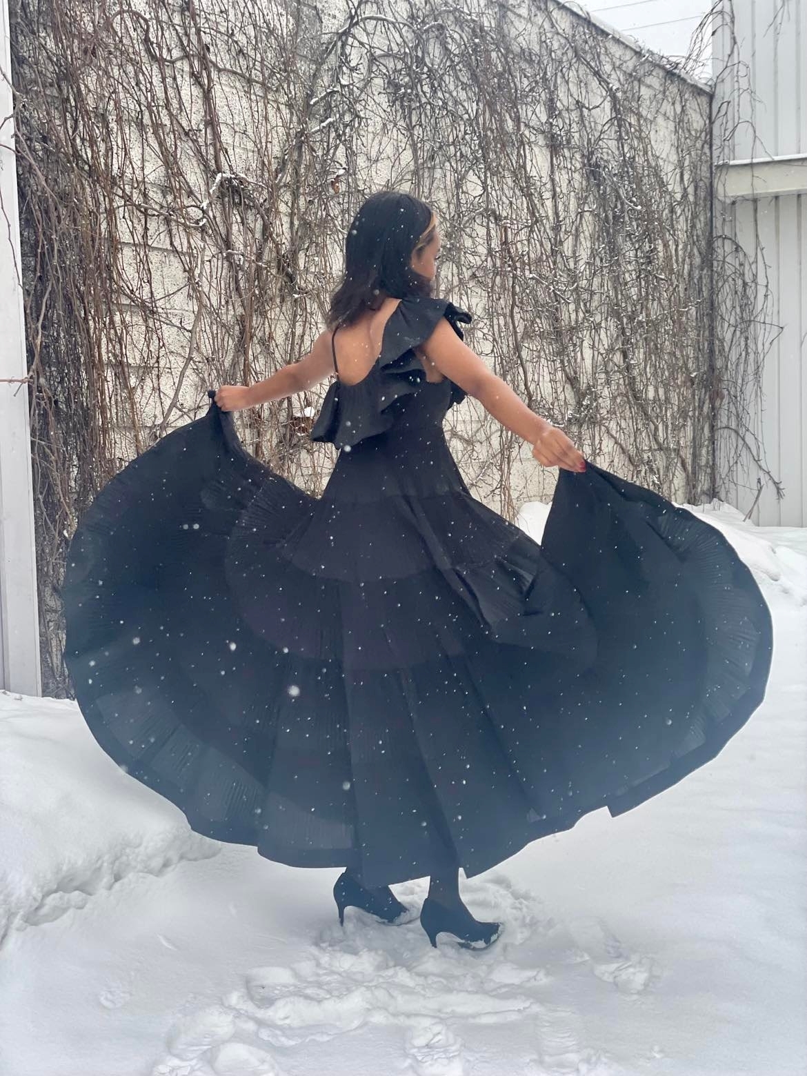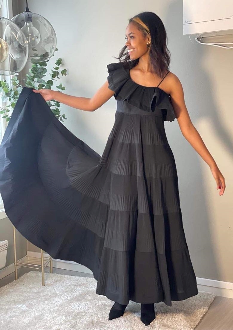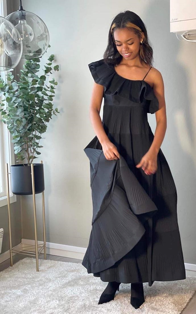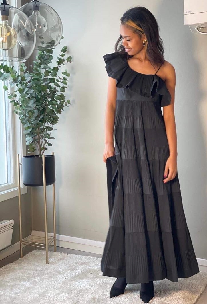 En drøm av en kjole som bare må oppleves! Lang kjole med rysjer og volanger. Stropp på den ene skulderen og skråskjærte volanger på den andre. Glidelåslukking i siden. MYE skjørt med lette plissè detaljer.
