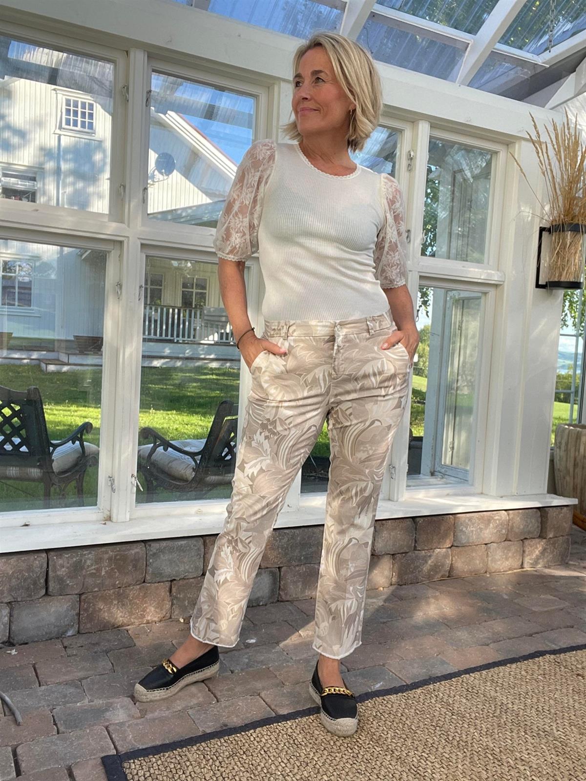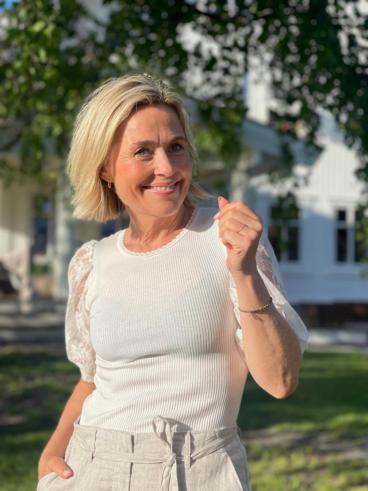 Brasilia silk t-shirt fra Rosemunde. Ribbestrikket topp med kort pufferm i gjennomsiktig blondestoff. Rund hals. Bølgekant nederst. Finnes også i sort. Max krymp 5%.