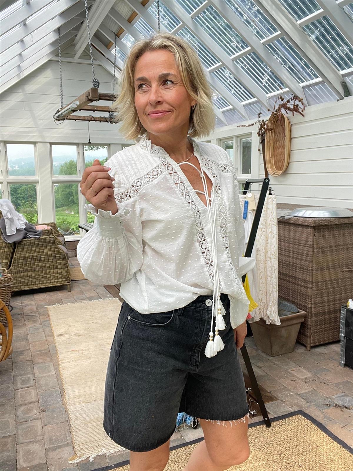 Carrie Short Cindy fra Abrand. Shorts i relaxed fasong. Klassisk fem lommers modell med rå kant nederst på beina. Høy på livet. Lukking med glidelås og knapp. 100% bomull.
