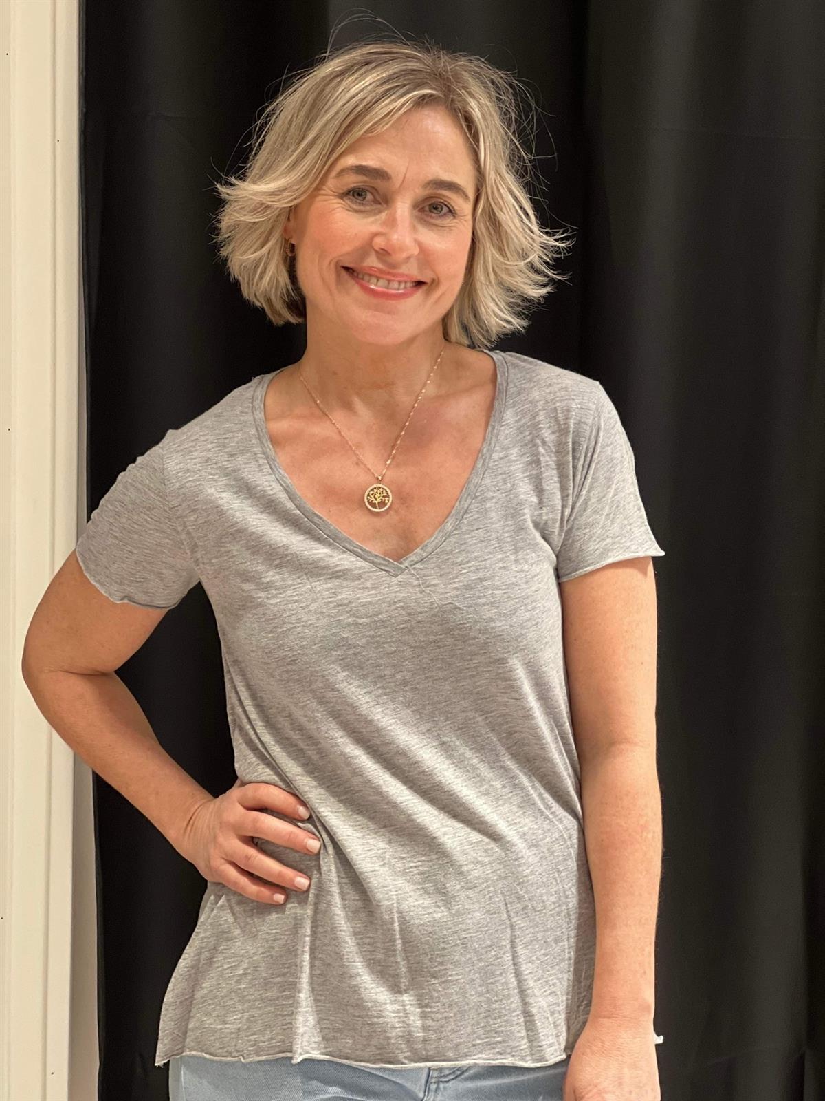 Jacksonville fra American Vintage. Basic v-hals t-skjorte i lys grå. Tynn og delikat kvalitet. A-fasong. Normal i størrelsen.