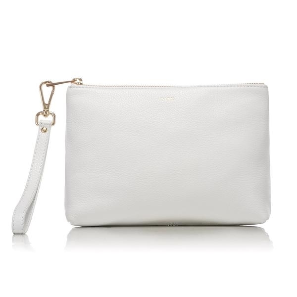 LEATHER STANDING POUCH WHITE fra Dark. Nydelig og eksklusiv kvalitet, i kalve skinn. Strap til ha rundt håndledet følger med. Liten lomme med glidelås på innsiden. 21,5 x 15 12,7 cm. Metallet er : Zinc Alloy