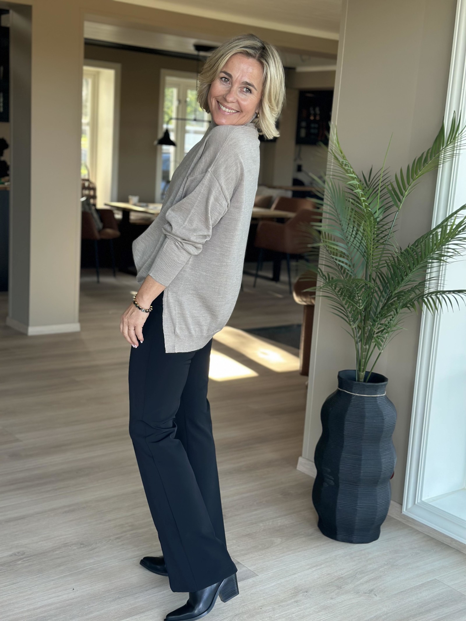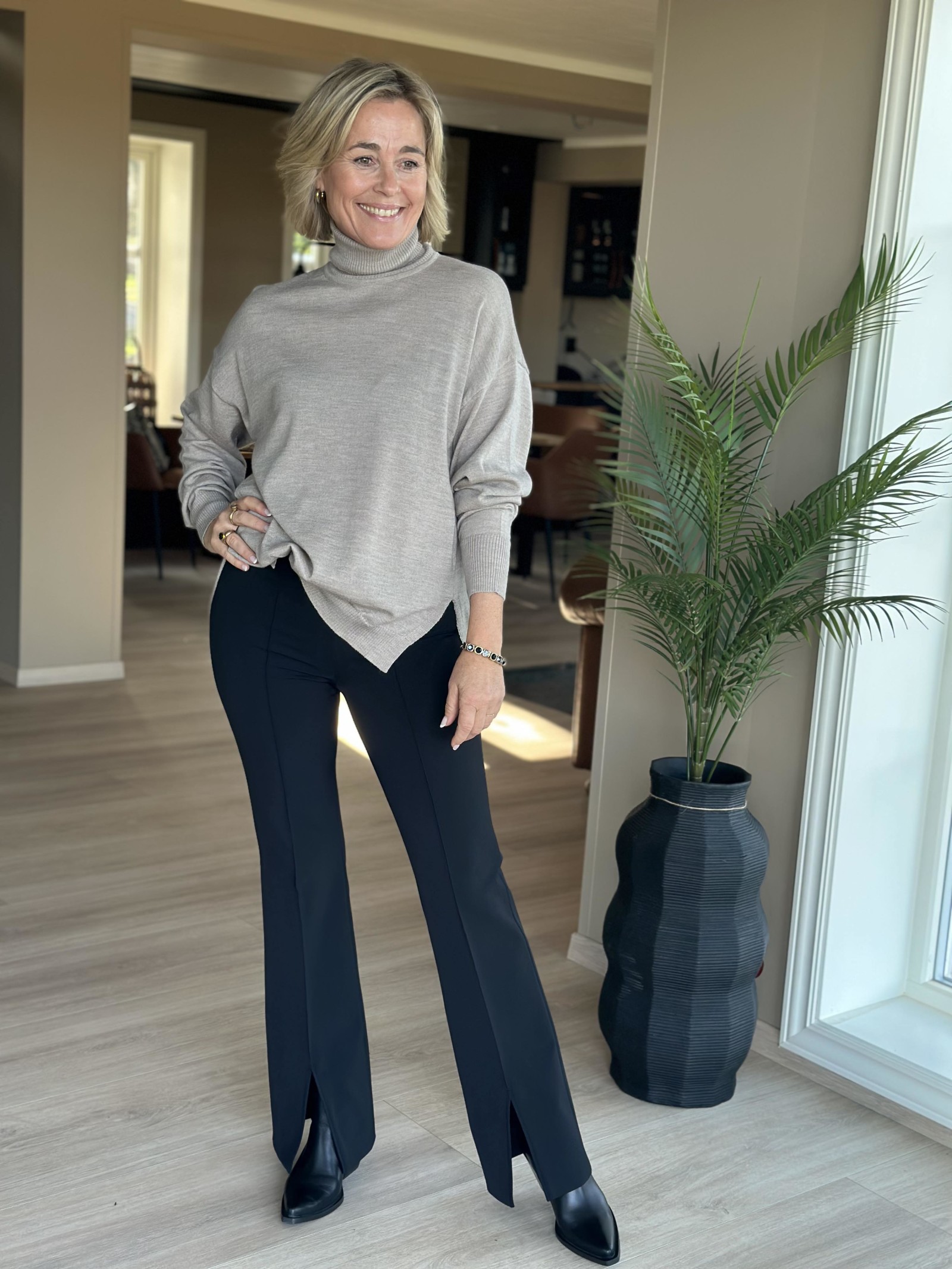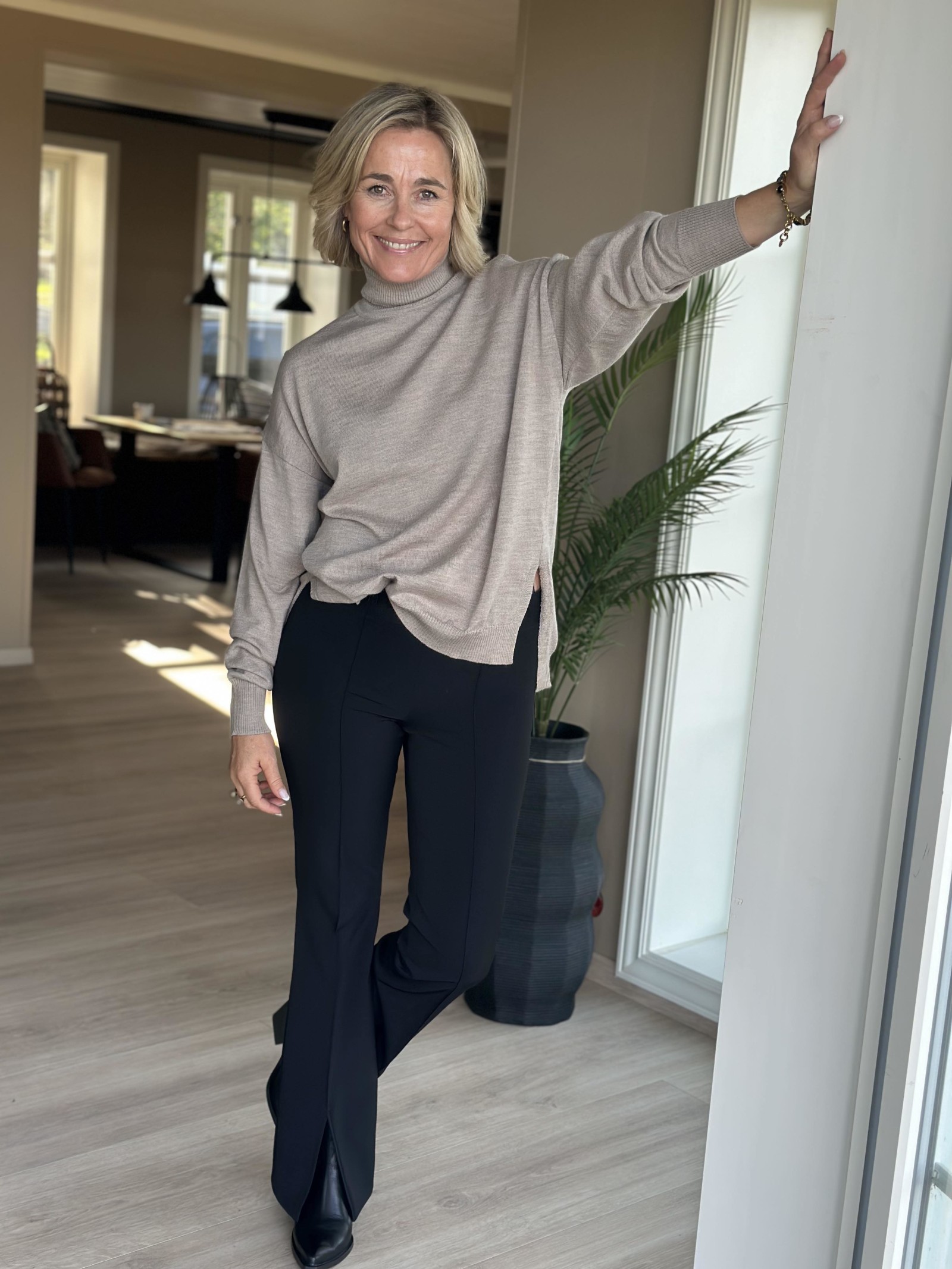 Deilig ullgenser med lange armer og høy hals. Den har splitter i hver side og er noe lengre bak.